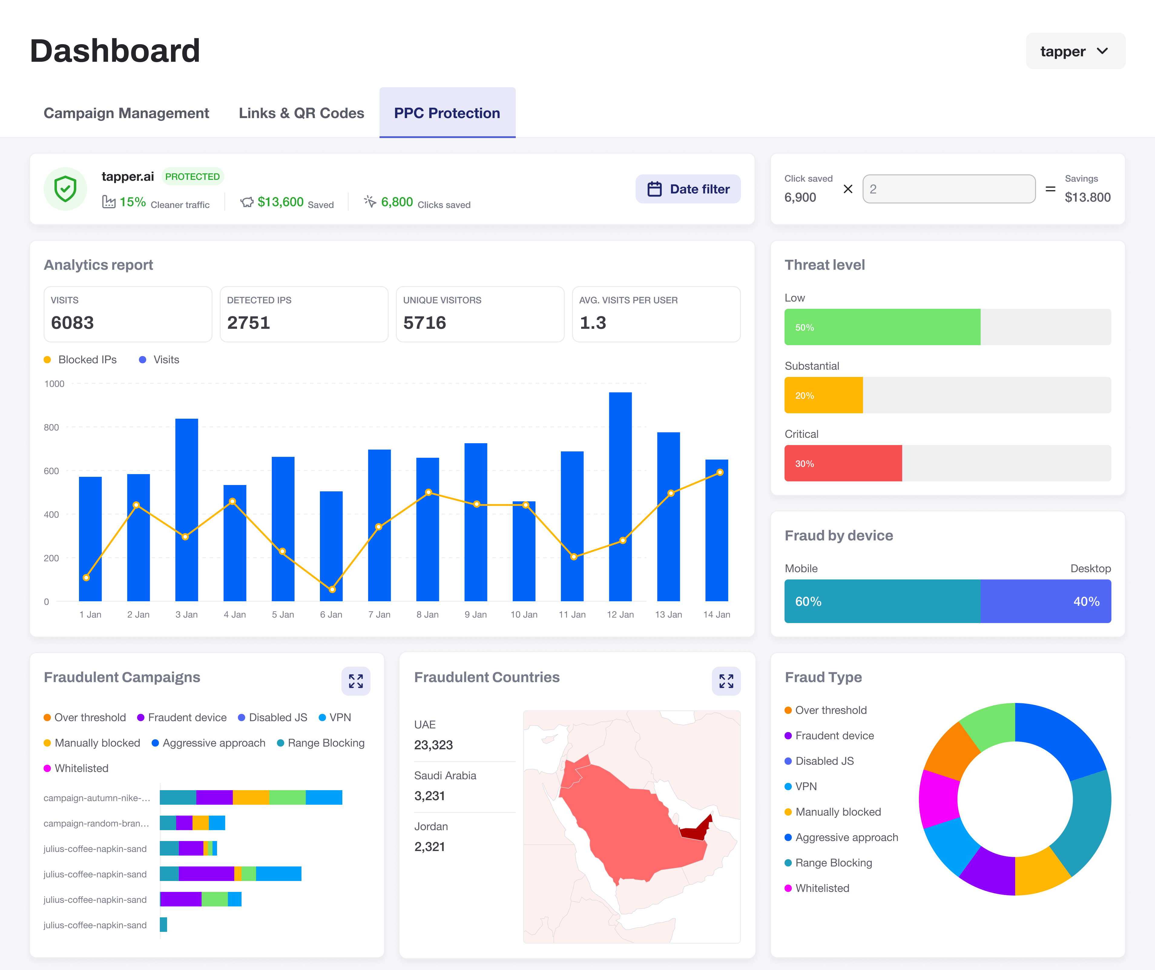 Using Tapper paints a distinct picture. Within our dashboard, we not only illustrate the proportion of invalid and subpar traffic within the total, but also furnish additional details about the bots and the rationale behind their blockade.