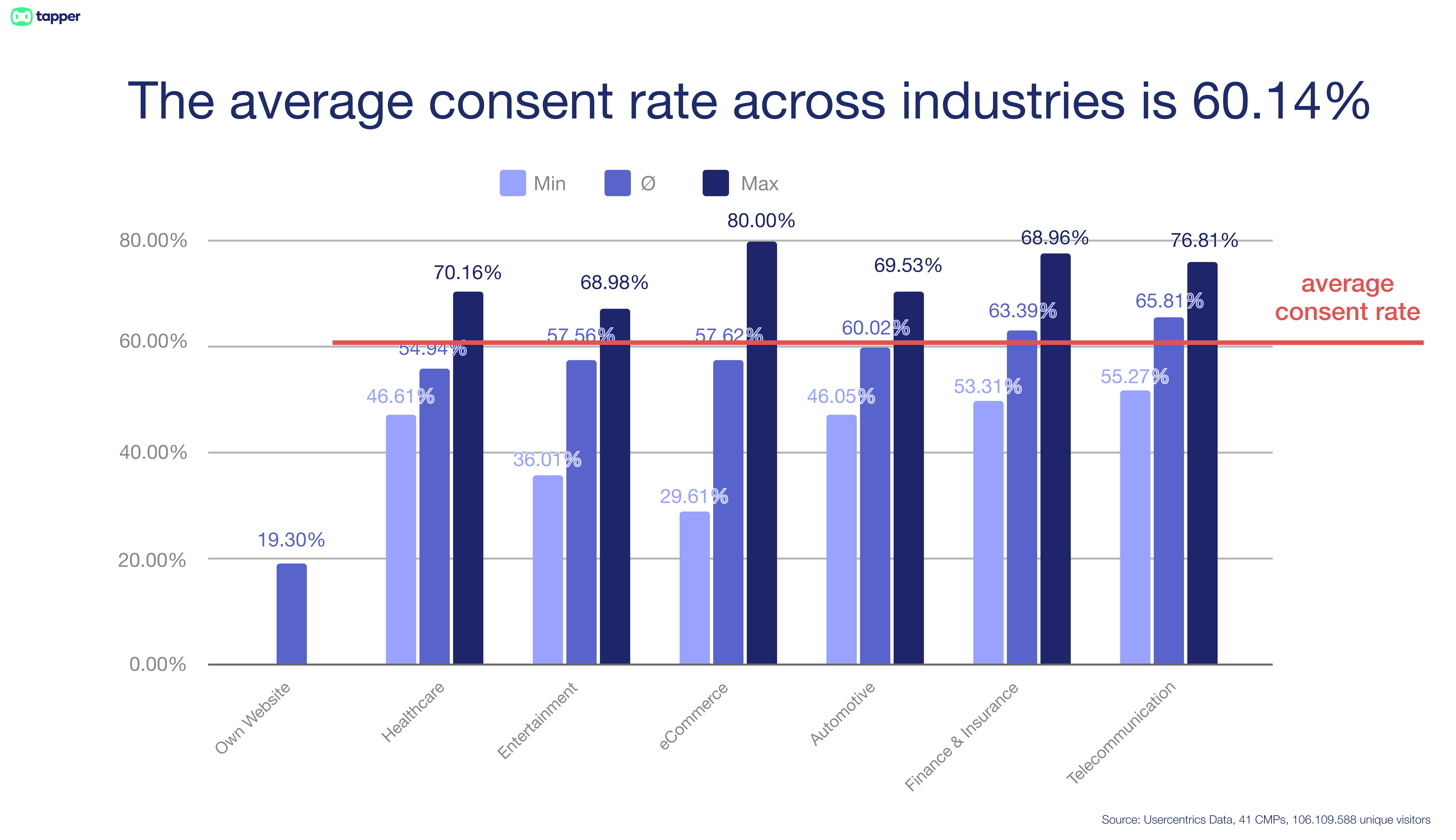 A similar pattern can be observed across different industries. While the healthcare sector typically sees an average opt-in rate of around 55%, industries such as finance & insurance and telecommunications experience higher rates, approaching 65%. On average across all industries, the opt-in rate stands at approximately 60.14%.