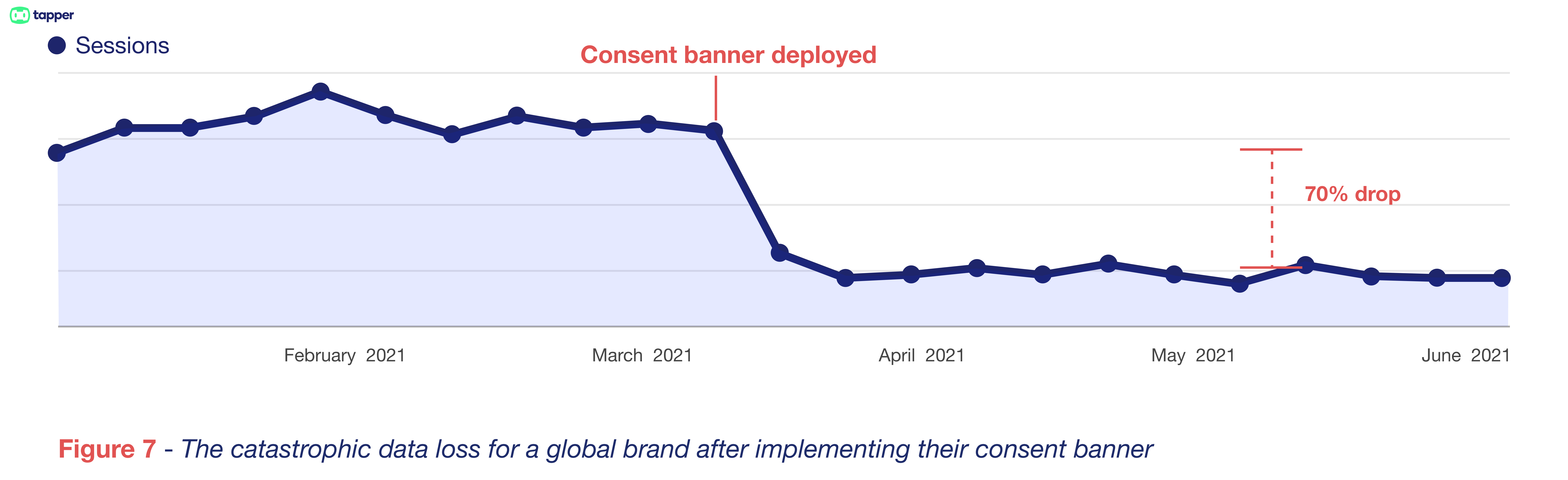 A case study from analytics expert Brian Clifton shows the impact opt-in requests can have on your analytics numbers. After implementing a Consent Management Platform (CMP) on a client’s website and linking it to Google Analytics, numbers plummeted 70%.