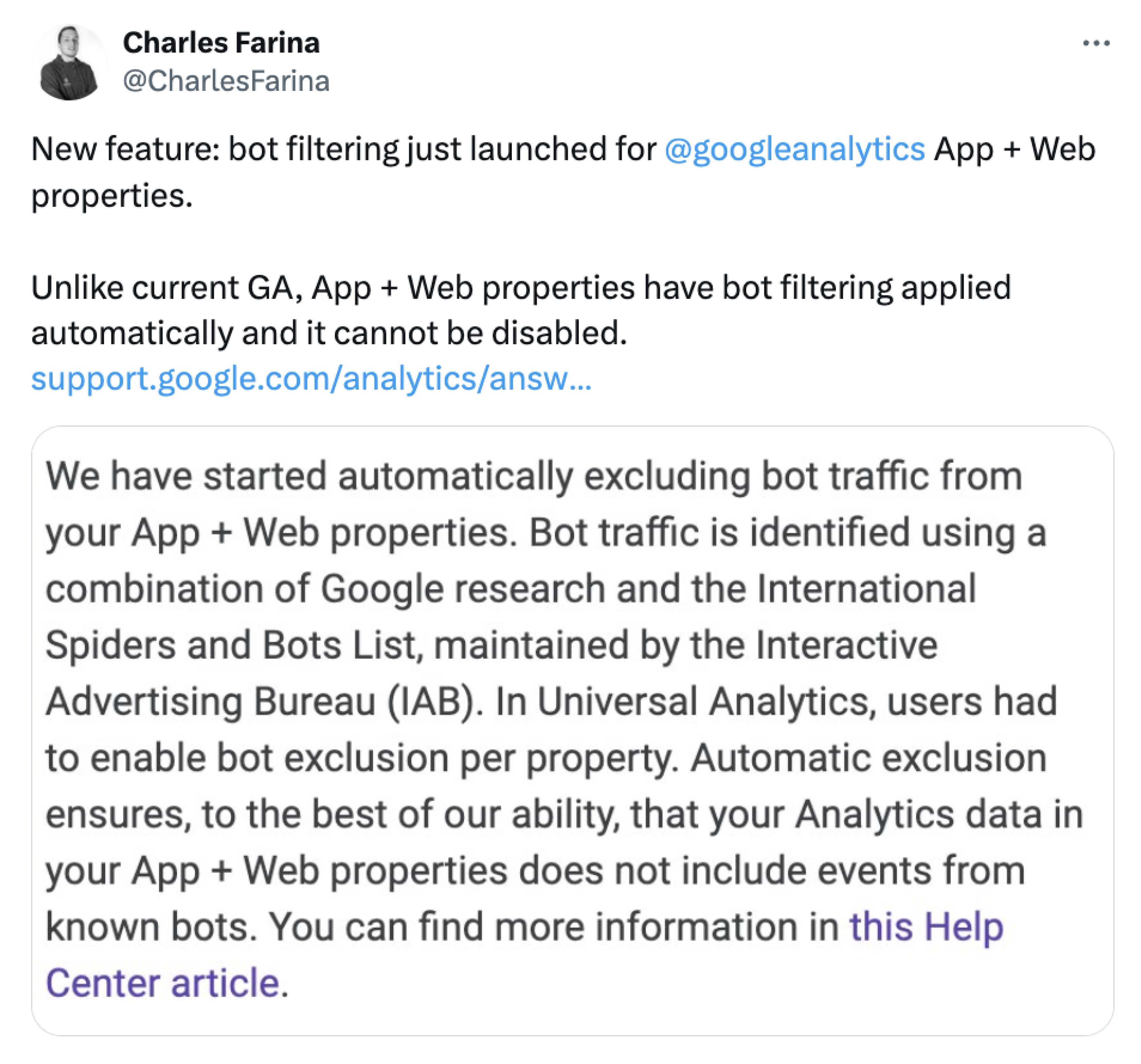 Furthermore, apart from the lack of transparency in bot detection, it's impossible to ascertain the extent of bot traffic excluded from Google Analytics.